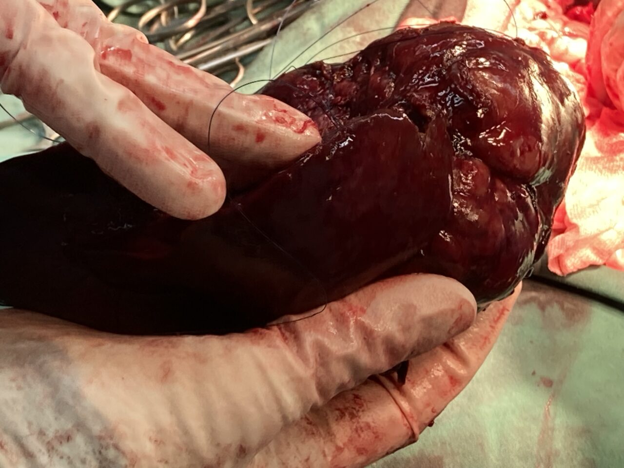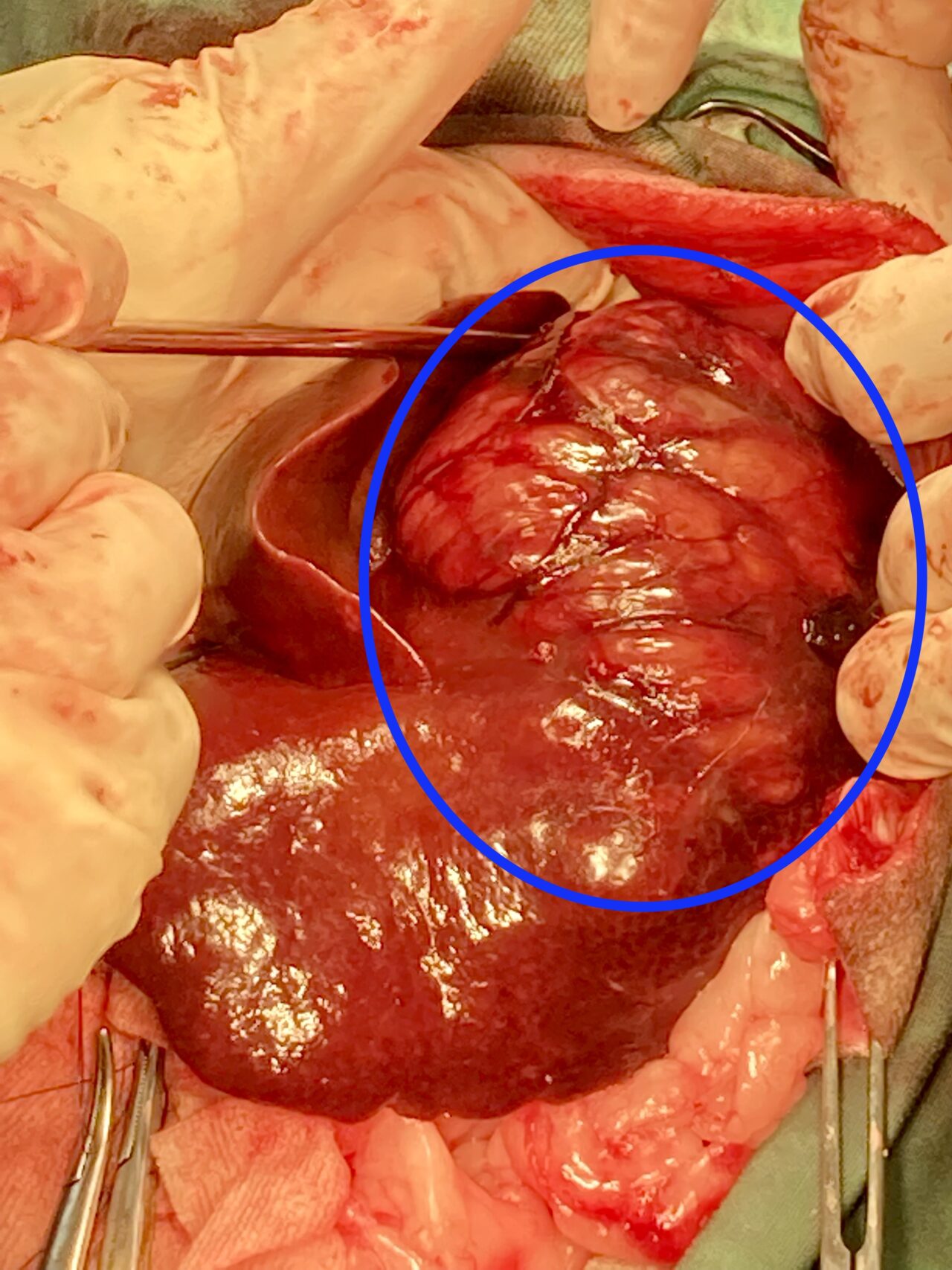 腫瘍は肝臓の内側左葉から発生しており、肝葉切除を実施しています。