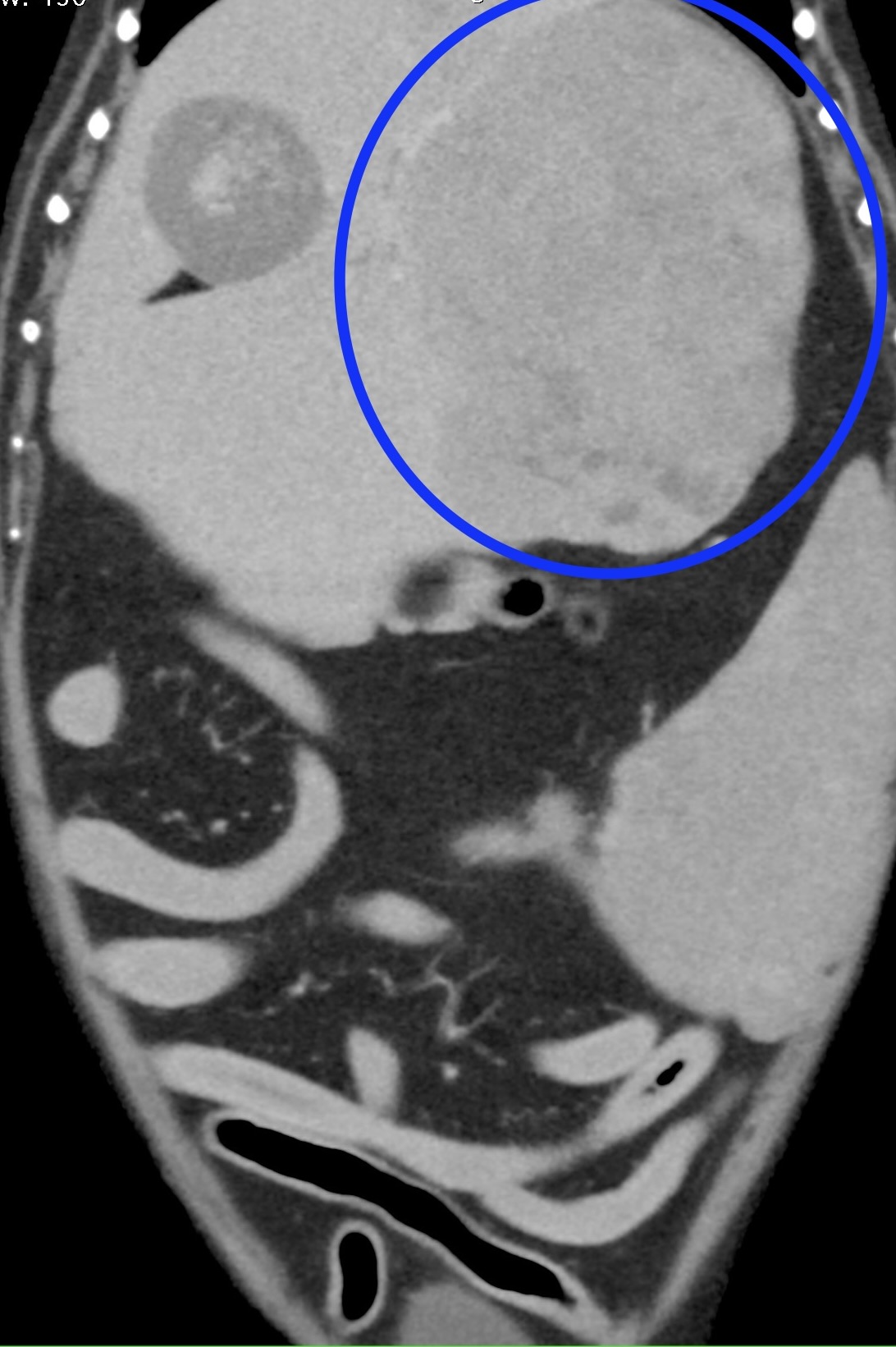 CT所見です。肝臓の左側に大きな塊状病変が認められます。